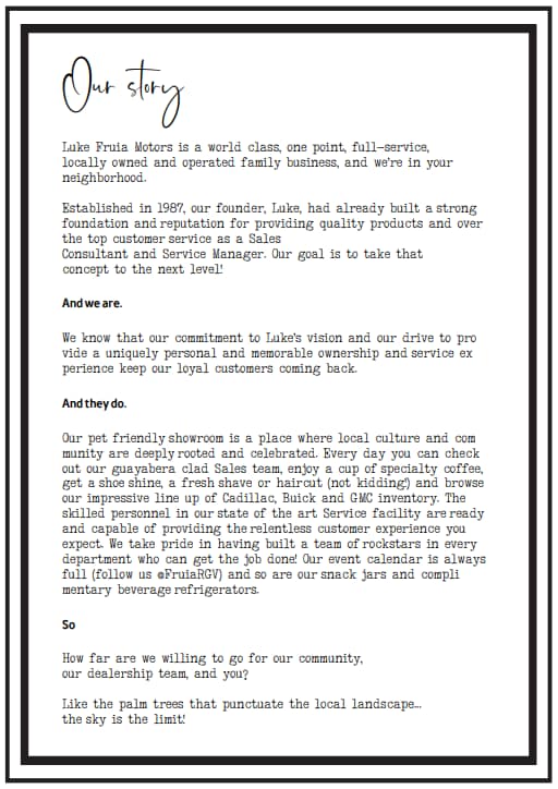 While providing you with new and preowned cars, along with parts and service is our focus, at Luke Fruia Motors we strive for much more. We want to give those in Brownsville and others we serve in Harlingen, McAllen, Mission TX, Rio Grande Valley an enjoyable and positive experience every time you come to visit us whether it's to buy, or service your Cadillac model. We take great pride in it and demonstrate it by offering the highest levels of care and customer service.
